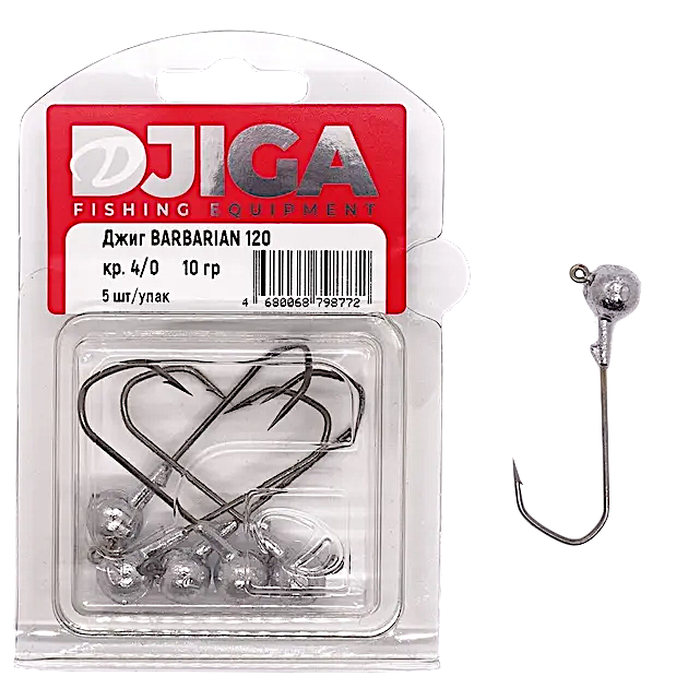Джиг-головка Djiga Barbarian 120 обеспечивает стабильность игры силиконовых приманок. Она выпускается в широком весовом диапазоне, что позволяет использовать ее для оснащения твистеров, виброхвостов и слагов среднего и крупного размера. Крючок изготовлен из прочной проволоки и имеет угловатую форму, за счет чего при забросах силикон не сползает и его не приходится постоянно поправлять.