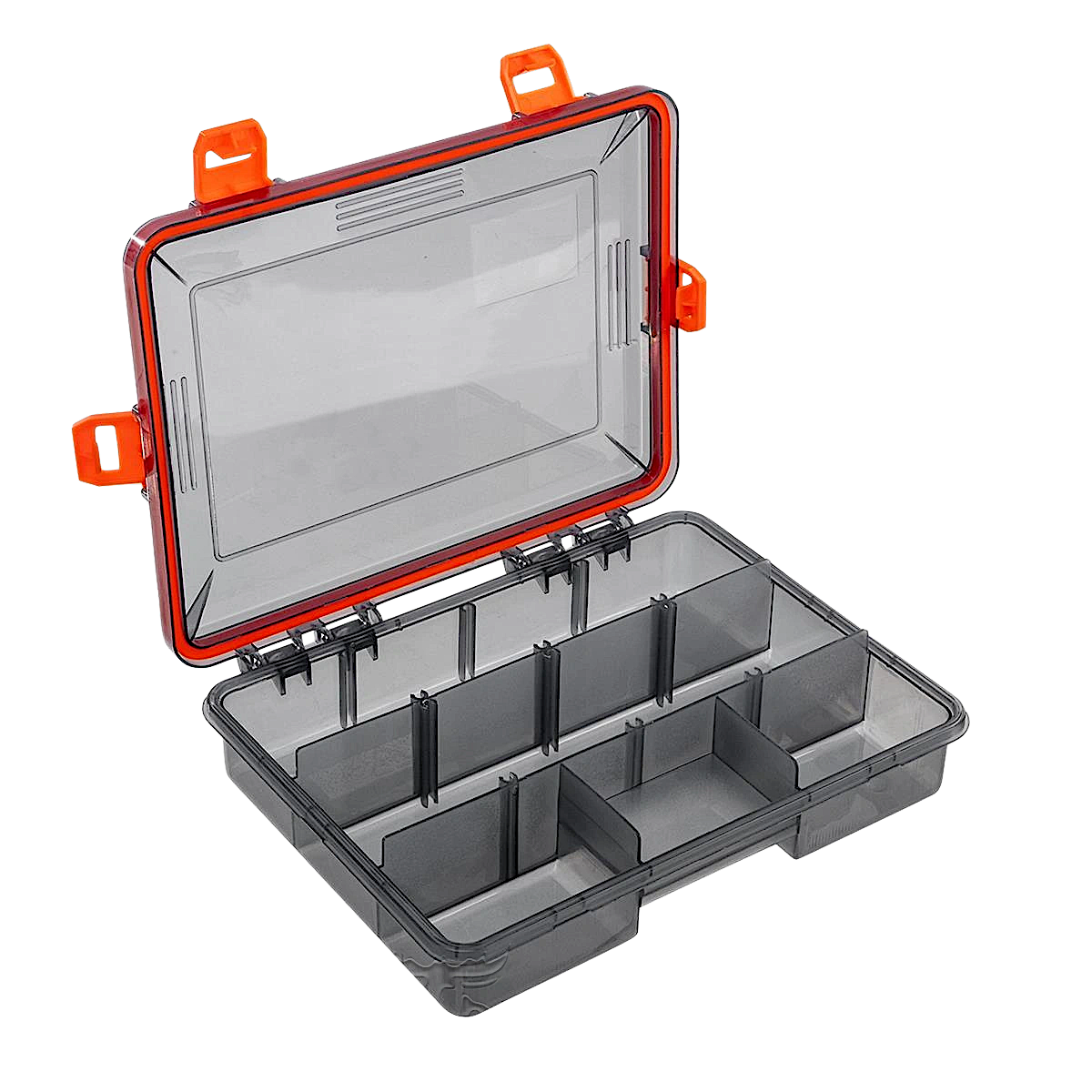 Коробка выполнена в виде кейса, в нижней части которого расположены отделения под рыболовные снасти. Крышка коробки оснащена уплотнительной резиновой лентой, которая позволяет сохранить содержимое сухим. Четыре защелки надежно фиксируют коробку в закрытом состоянии.