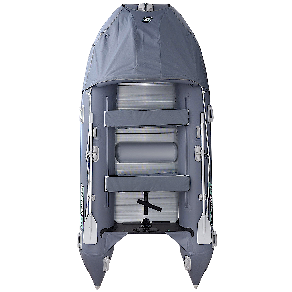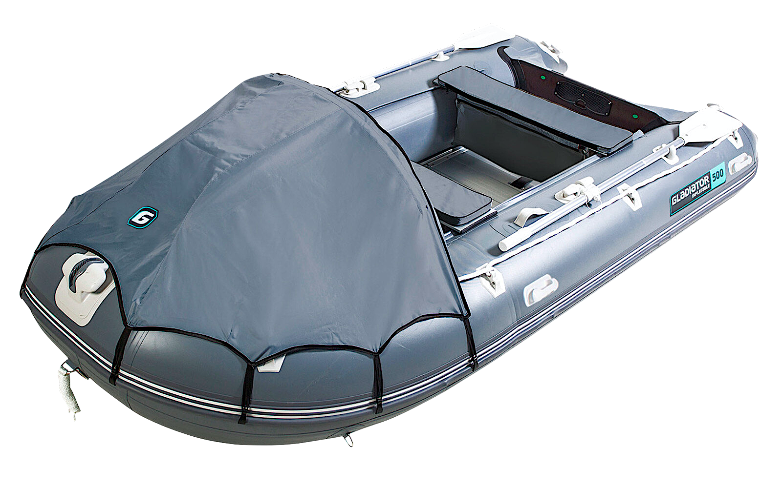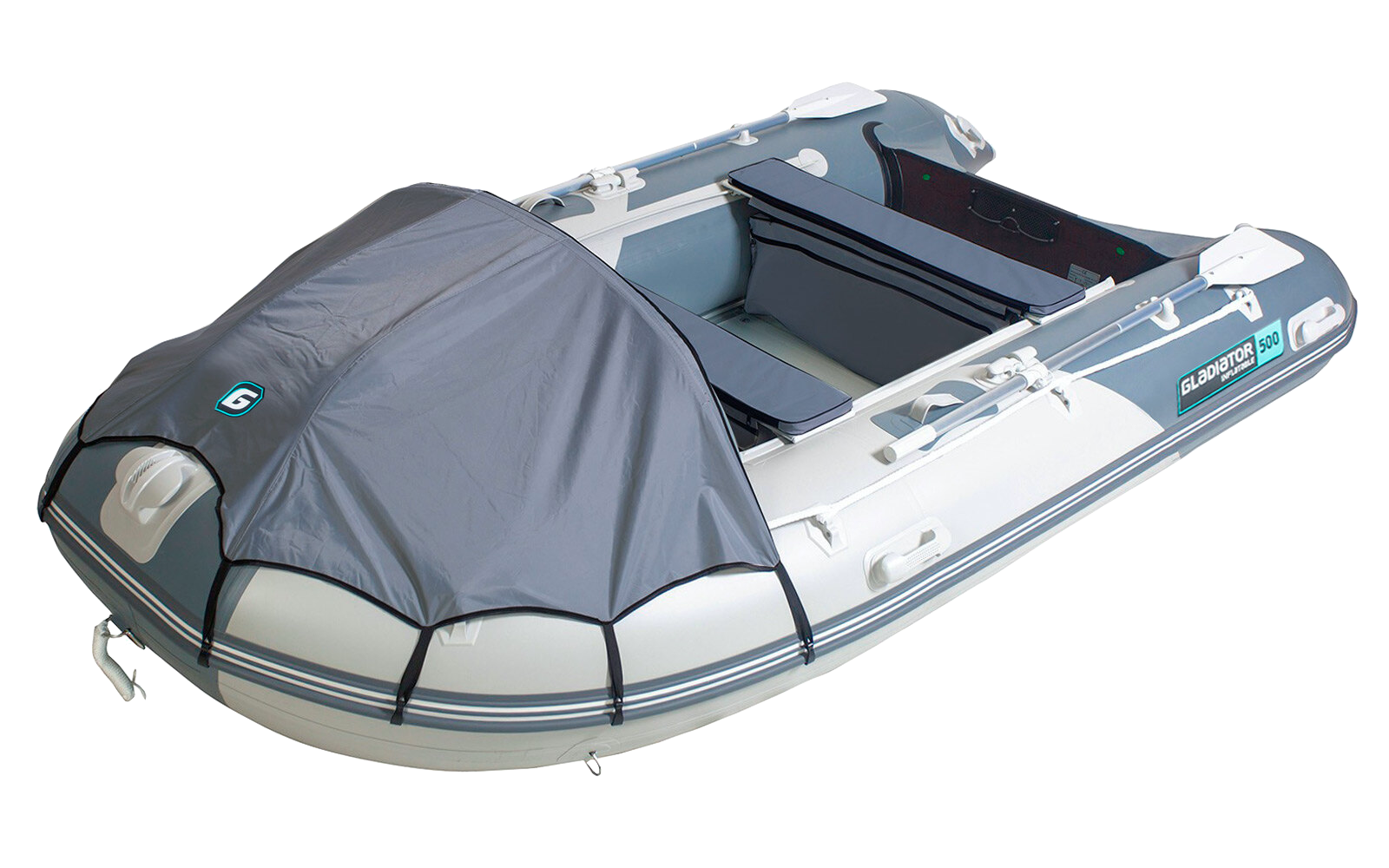 Десятиместная килевая моторная лодка GLADIATOR D500AL светло/темно-серого цвета со стационарным транцем под мотор до 50 л.с.