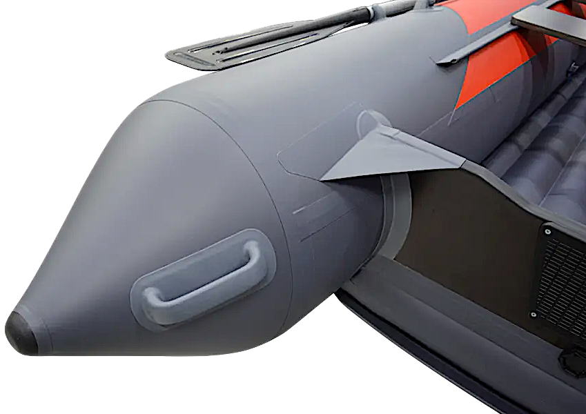 В кормовой части надувной лодки СТЕЛС 355 АЭРО предусмотрены удобные ручки, предназначенные для переноски лодки. Они расположены с внутренней стороны конуса, благодаря чему можно взять лодку двумя руками именно со стороны кормы. Это обеспечивает более надёжное и устойчивое удержание при переноске. В носовой части лодки также имеется удобная рым-ручка. Она служит для дополнительной фиксации или для удобства при перемещении лодки в других ситуациях. Наличие ручек в обеих частях лодки делает её более удобной в обращении и транспортировке.