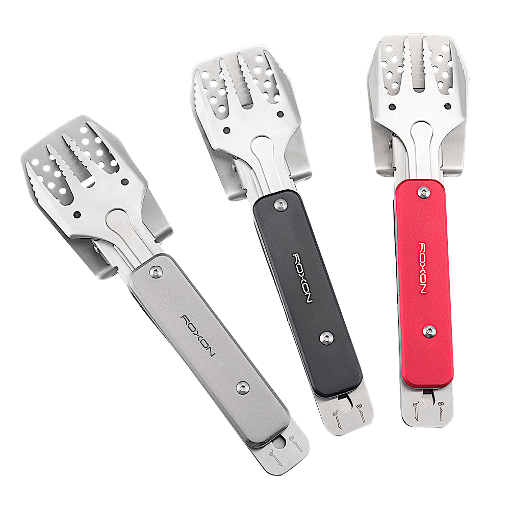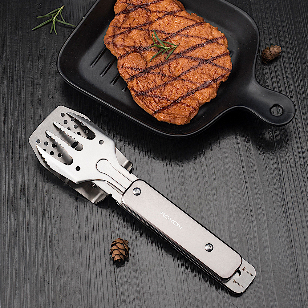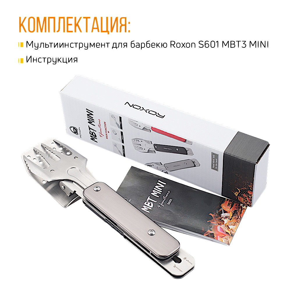 Модель Multi BBQ Tool MBT MINI S602 от бренда Roxon – это компактная версия мультиинструмента для приготовления барбекю. Он состоит из металлических лопатки и вилки, которые могут использоваться как самостоятельные инструменты, а вместе образуют удобные щипцы. Кроме того, в инструмент встроена простая открывалка для бутылок.