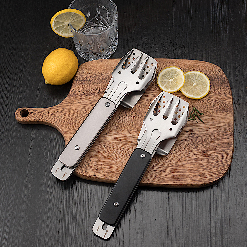 В сложенном состоянии два инструмент можно соединить между собою, чтобы они не потерялись, и положить для хранения в нейлоновый чехол на липучке. Можно соединить и готовые к использованию лопатку и вилку. В этом случае получатся щипцы, которыми удобно переворачивать мясо или овощи на гриле.