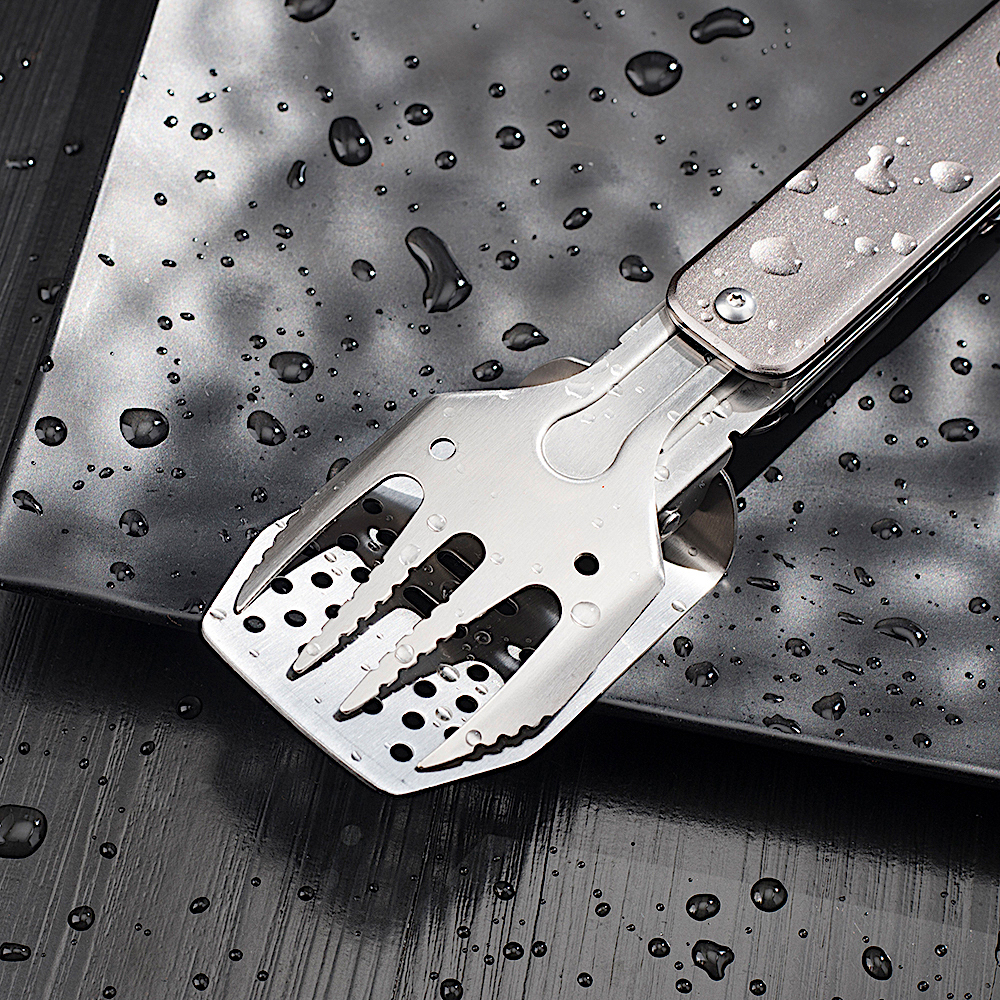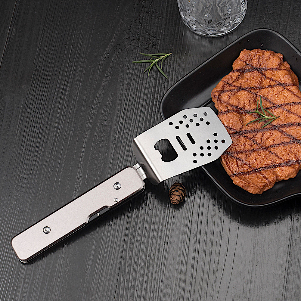 Вилка имеет 4 зубчика с небольшими зазубринами для большей надежности. Лопатка немного изогнута, чтобы работать ней было удобнее. Кроме того, на ее поверхности сделан целый ряд отверстий, чтобы сквозь них мог стекать лишний жир. Самое большое отверстие – это встроенная открывалка для бутылок.