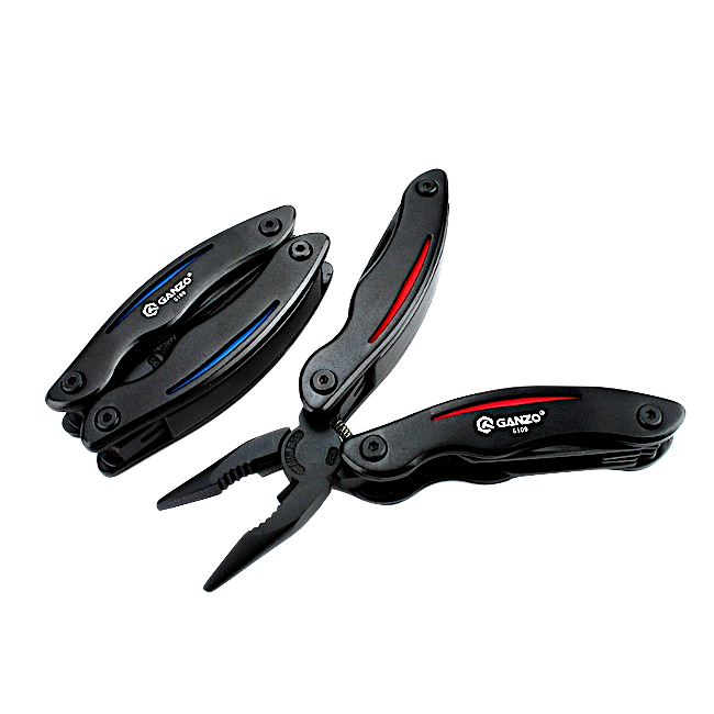 Отличительной особенностью мультитула Ganzo G109 является его привлекательный дизайн. Модель выпускается в двух вариантах: с синей или красной вставкой на черных рукоятках, что придает ему достаточно элегантный вид. В рабочем состоянии рукоятки мультитула выгнуты наружу и имеют эргономичную форму, способствующую удобному удержанию инструмента во время работы. Как и у большинства мультитулов, основным инструментом Ganzo G109 являются полноценные подпружиненные пассатижи (плоскогубцы). Наличие пружины повышает комфортность использования мультиинструмента.