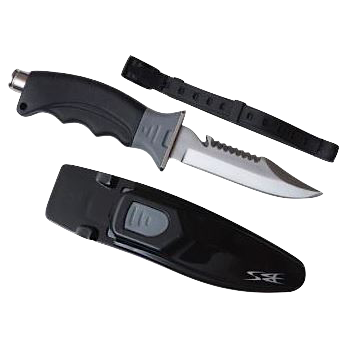Нож подводника из нержавеющей стали 420 J2 ss в комплекте ножнами и парой резиновых ремешков для крепления на руку или ногу пловца.