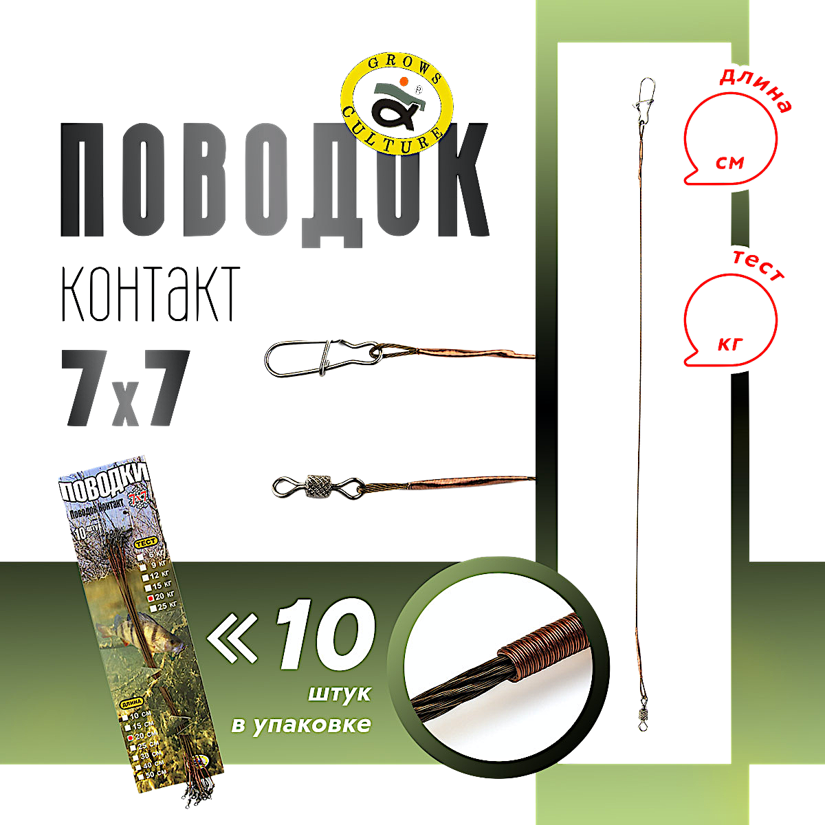 Поводки Grows Culture Контакт 7х7 предназначены для повышения надежности и долговечности снасти, особенно при ловле крупных хищных рыб, таких как щука или судак.