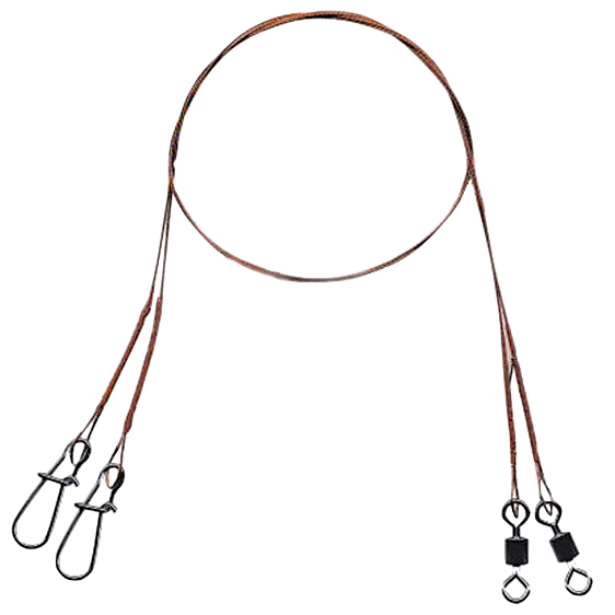 Формула 7x7 обеспечивает изделию эластичность, за счет которой наличие поводка не мешает игре приманки. Карабин и вертлюг зафиксированы с помощью обжимных трубок.