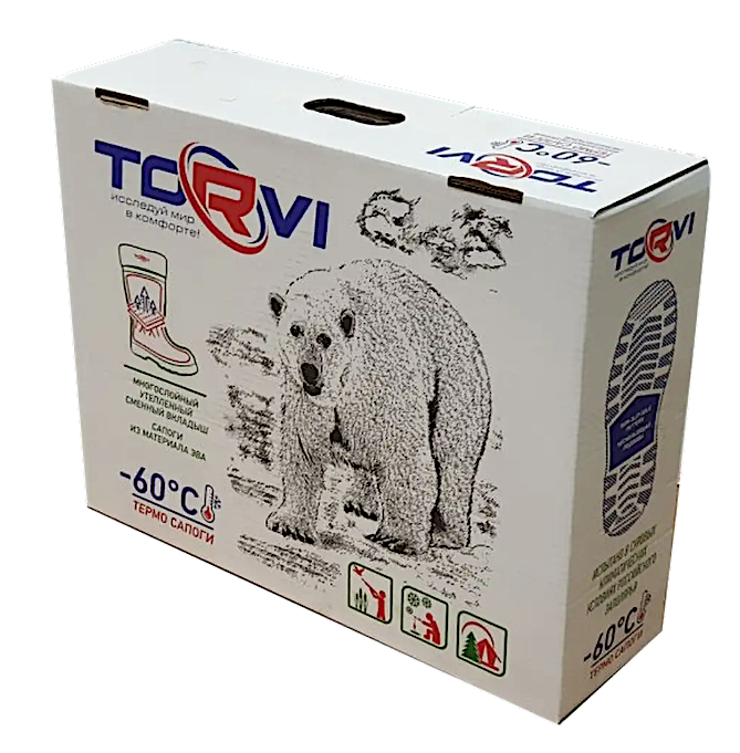Сапоги из ЭВА TORVI -60 °С имеют дополнительные защитные наплывы в области носка и пятки, а также особую, ячеистую структуру дна сапога — в ней скапливается влага, которая образуется вследствие разницы температур тела и воздуха.