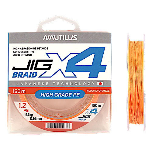 X4 Jig braid - большая линейка качественных, современных шнуров Nautilus. Изготовлены методом 4-х жильного плетения из PE волокон, повышенной прочности. Шнур обладает очень высокой абразивоустойчивостью и самой минимальной растяжимостью. Благодаря этим свойствам, отлично подходит для джиговой ловли, а так же для других типов спиннинговой рыбалки.