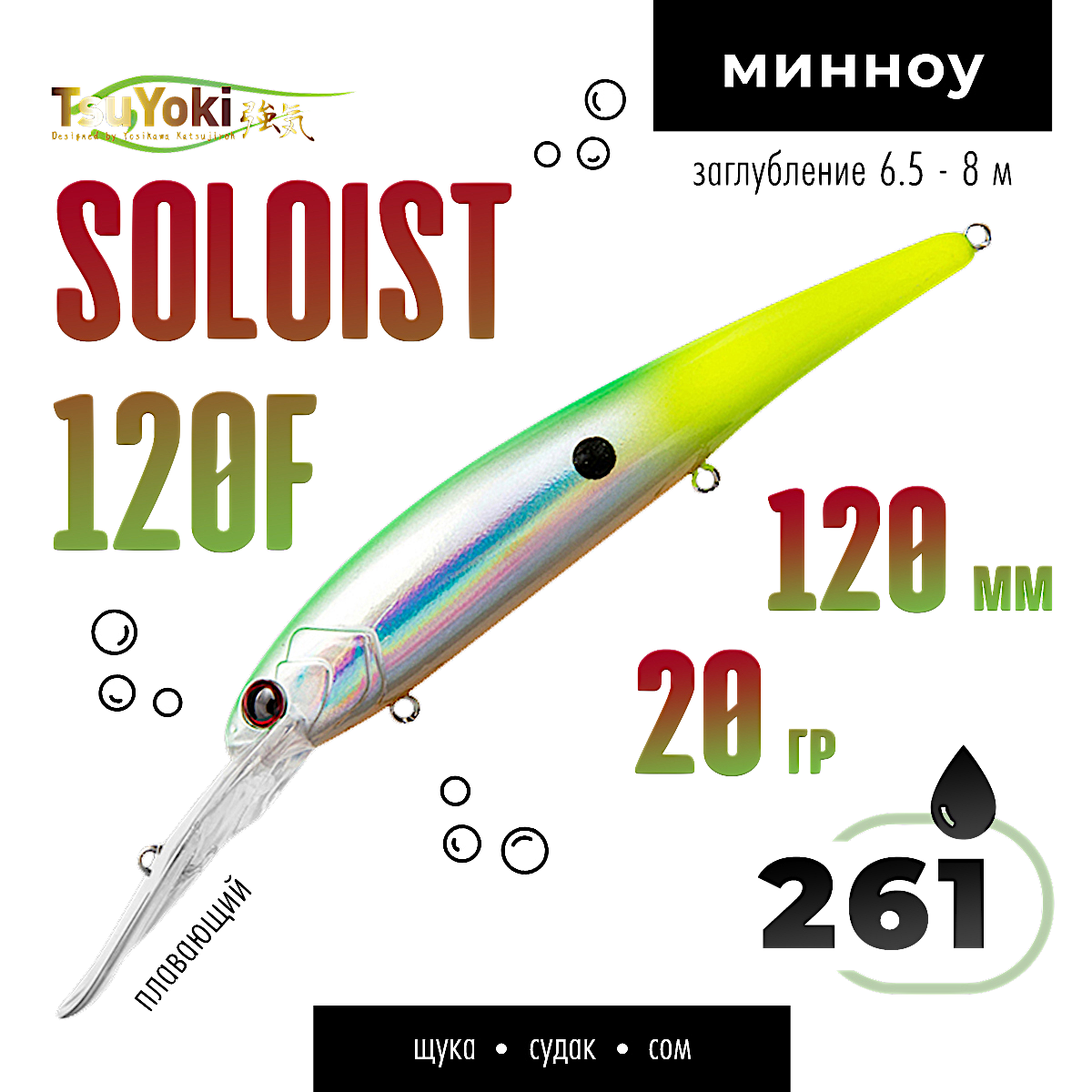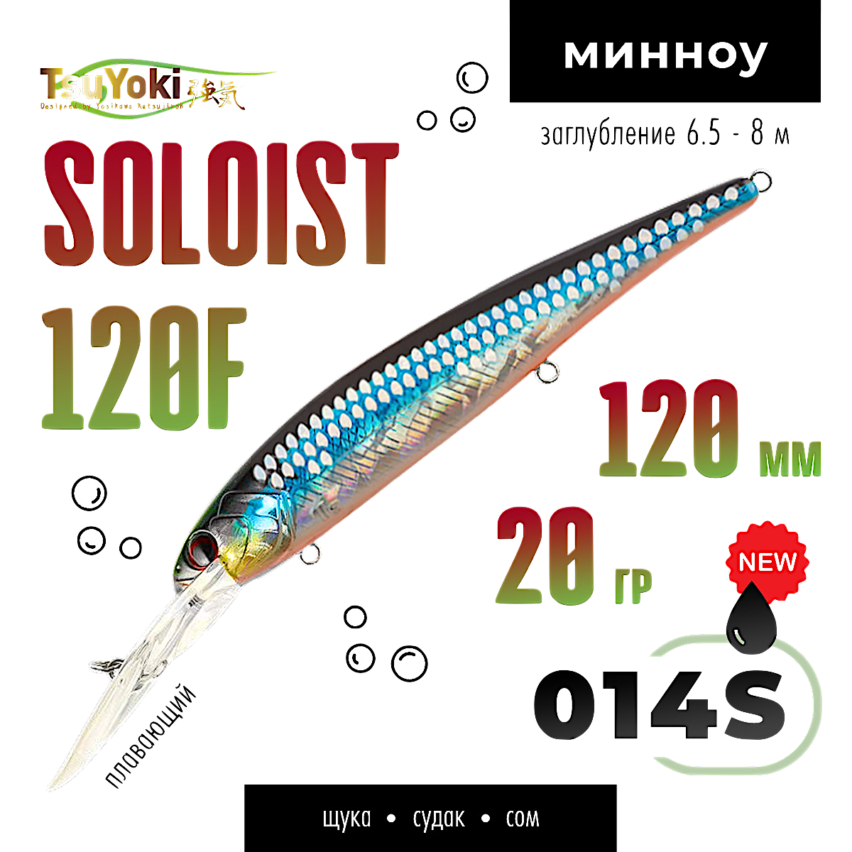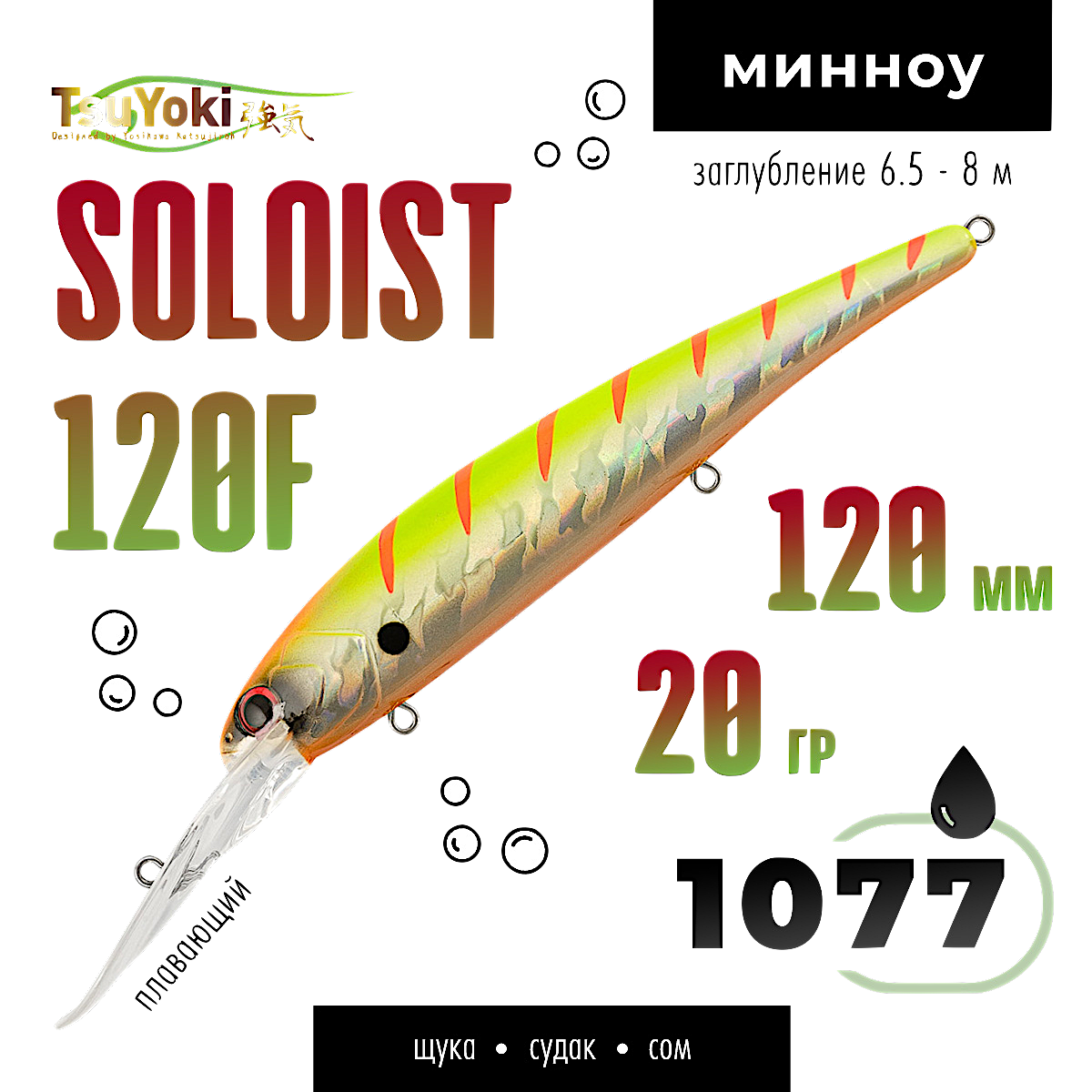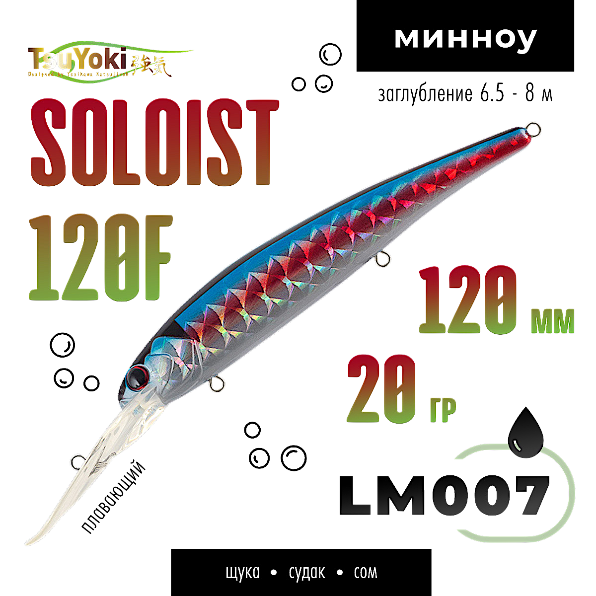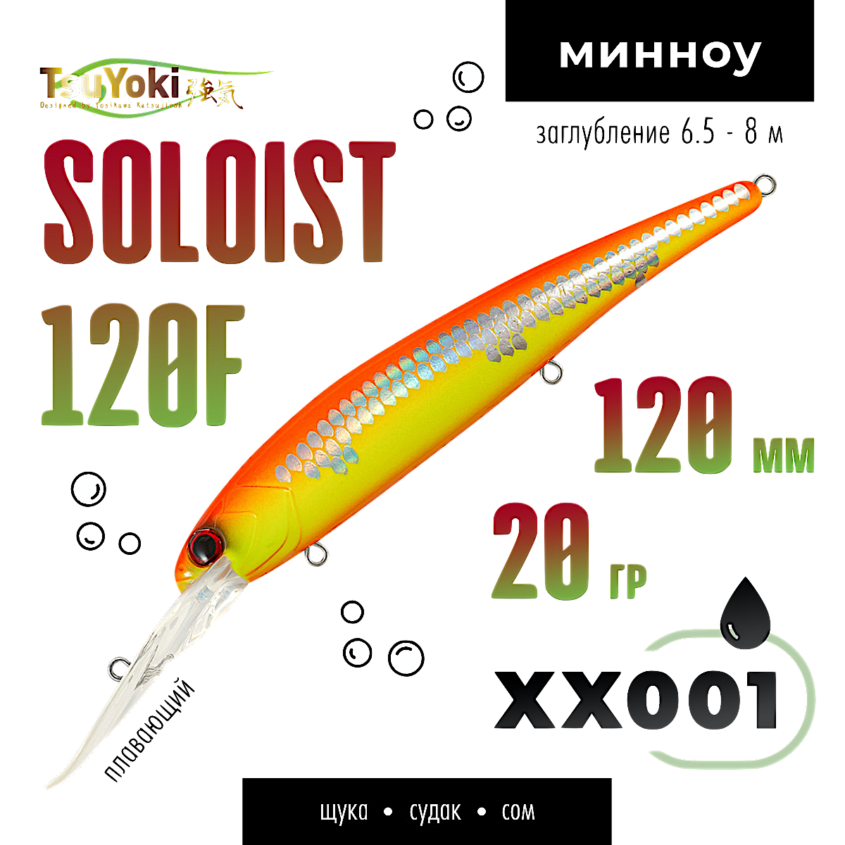 SOLOIST 120F имеет полностью гладкую поверхность. Головная часть приманки выполнена в виде головы рыбки, с рельефными жаберными крышками и вклеенными 3D глазами. SOLOIST 120F имеет систему баланса, шары которой выполняют функцию шумовго сопровождения, создавая дополнительный фактор привлечения для хищников. Воблер оснащен мощной фурнитурой, силовыми заводными кольцами и тремя тройниками Cultiva Owner. Общее исполнение воблера и его ЛКП на высоком современном уровне. В каталоге широкий выбор расцветок.